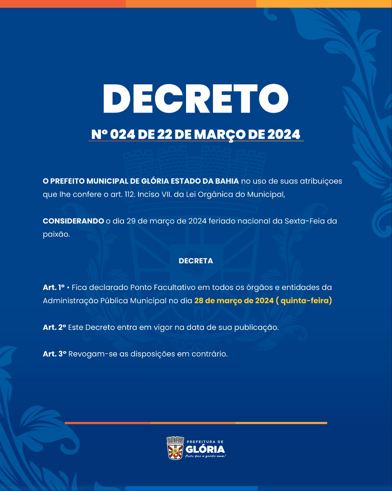 Bahia: Prefeitura de Glória emite DECRETA Ponto Facultativo quinta 28