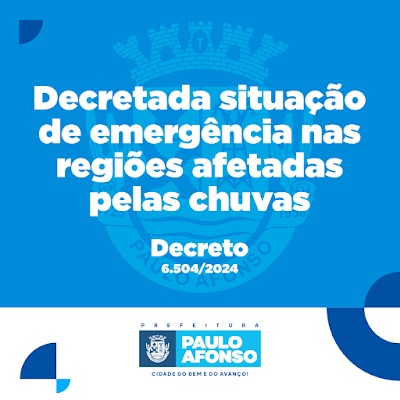 Considerando as fortes chuvas que caíram nos últimos dias no município, a Prefeitura de Paulo Afonso decretou situação de emergência por meio do Decreto nº 6.504, de 19 de fevereiro de 2024.