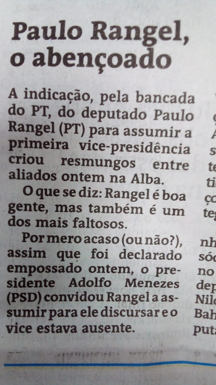 O deputado vice-presidente da ALBA Paulo Rangel-PT foi citado na Coluna Levi Vasconcelos do Jornal A Tarde de hoje 02 de fevereiro de 2021, com a seguinte manchete: “Paulo Rangel, o abençoado”. No texto, o colunista afirma que houve resmungos entre aliados. “Rangel é boa gente, mas é um dos mais faltosos”.