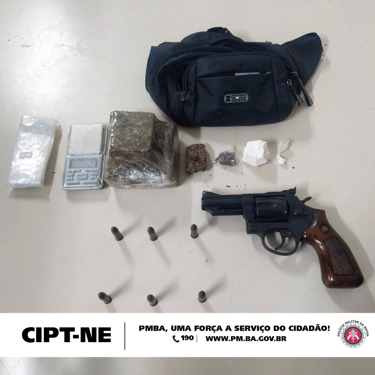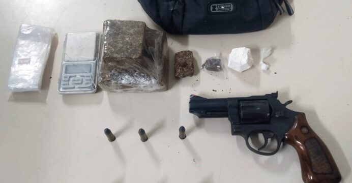 Dentre os materiais confiscados estavam: um revólver calibre .38 com munições pinadas, substâncias análogas à cocaína e maconha – incluindo um tablete médio e trouxinhas dos narcóticos –, uma balança de precisão e embalagens destinadas ao acondicionamento de drogas. Uma pochete preta, contendo os itens ilícitos, foi encontrada sobre o telhado da residência.