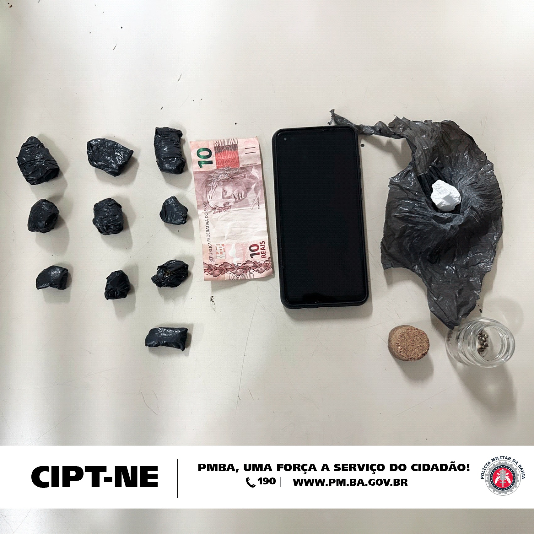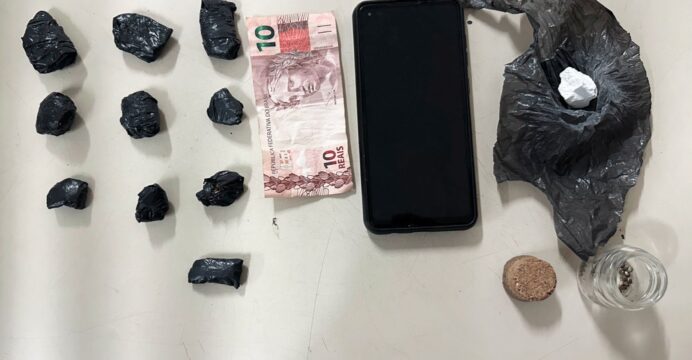– 10 trouxinhas de substância análoga à maconha; – 01 trouxinha de substância análoga à cocaína; – 01 pote de vidro pequeno contendo sementes de maconha; – 10 reais em espécie; – 01 smartphone Samsung A21s de cor branca.