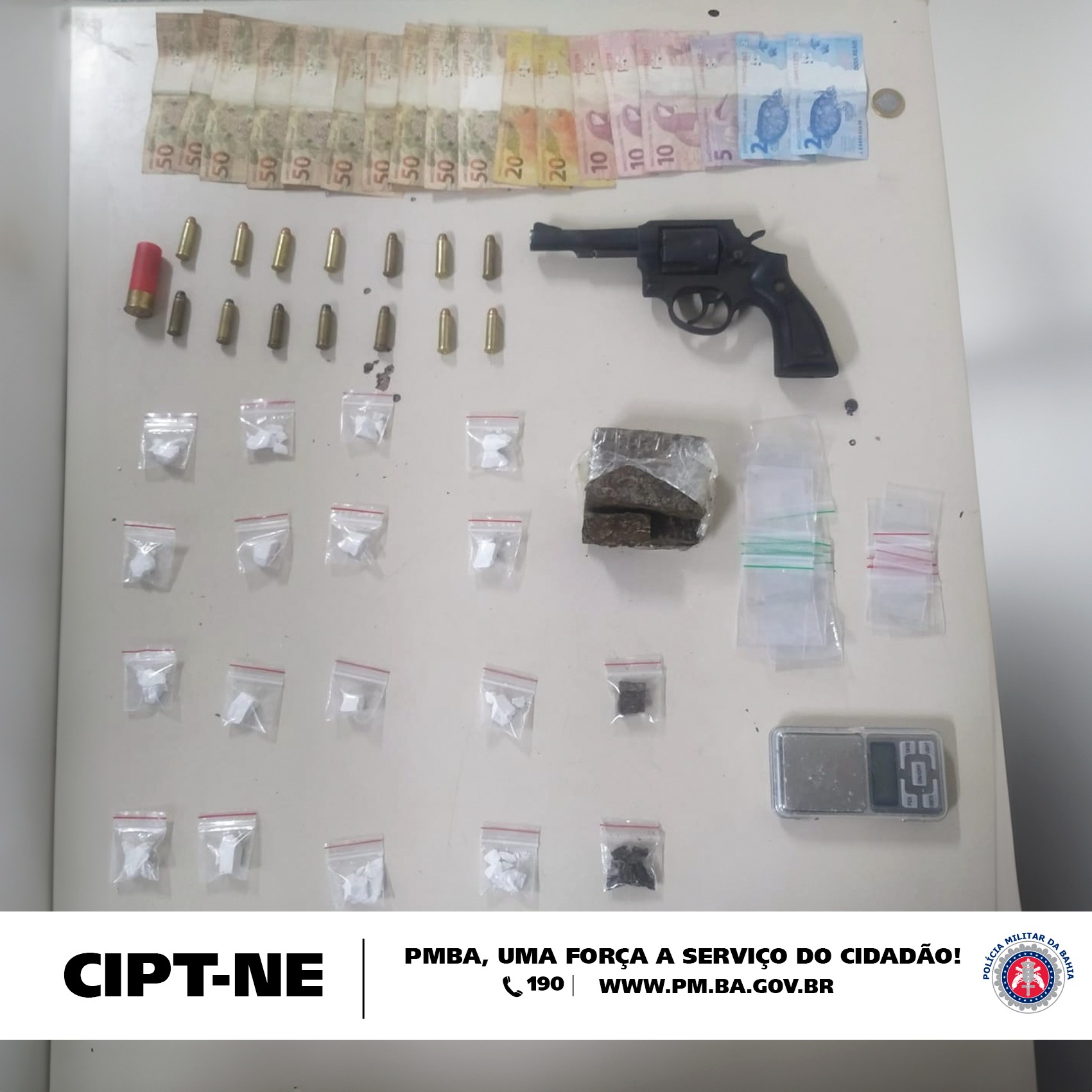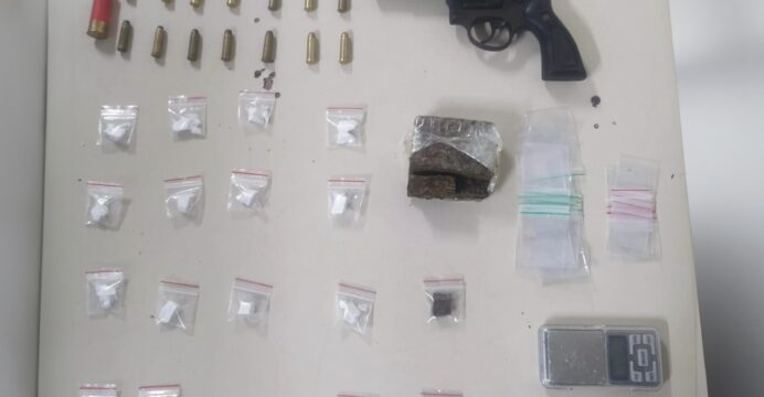 • Um revólver calibre .38 com munições intactas; • Substâncias análogas à cocaína e à maconha; • Uma balança digital de precisão; • R$ 580 em espécie e embalagens para acondicionar drogas.