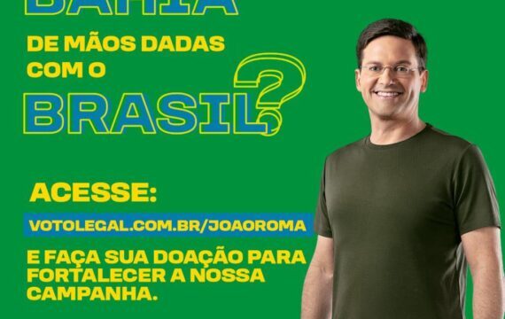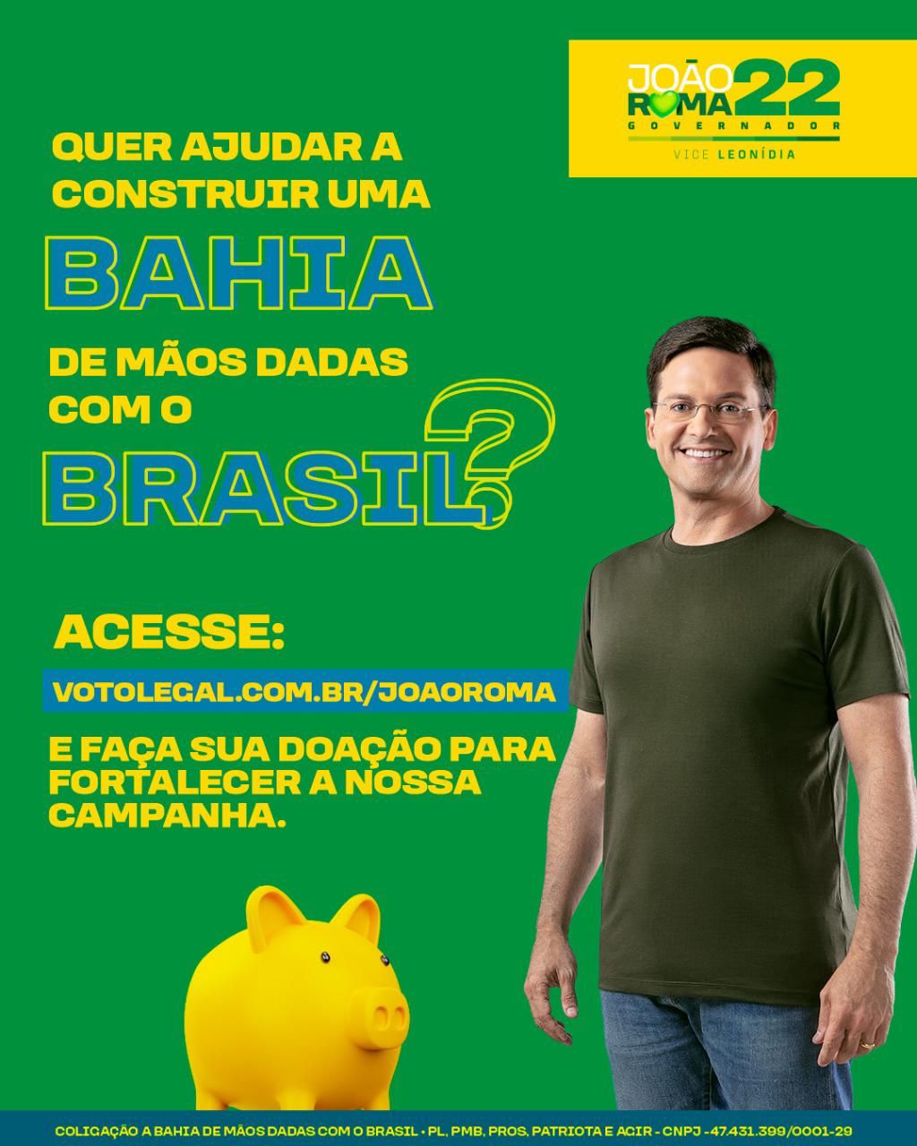 “Se você deseja uma Bahia transformada, que seja motivo de orgulho para todos os baianos, faça a sua doação online para fortalecer a campanha de João Roma. A doação é fácil, basta acessar votolegal.com.br/joaoroma e contribuir com qualquer valor. Vamos juntos construir essa nova Bahia de mãos dadas com o Brasil!”, diz a nota.