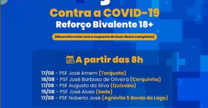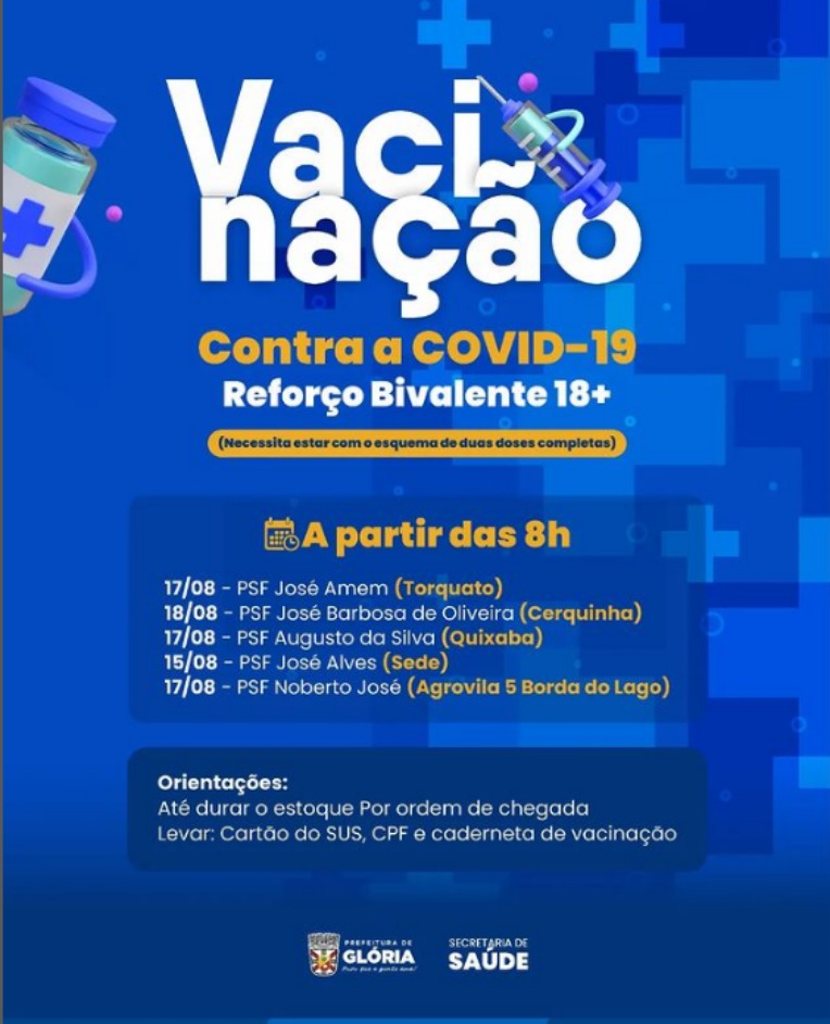 A Prefeitura de Glória (BA), através da SMS – Secretária Municipal de Saúde por meio da equipe de imunização, continua com o cronograma da campanha de vacinação, contra a COVID-19 / reforço Bivalente 18+, nos dias 15,17 e 18 de agosto, na Sede do município e na área rural.