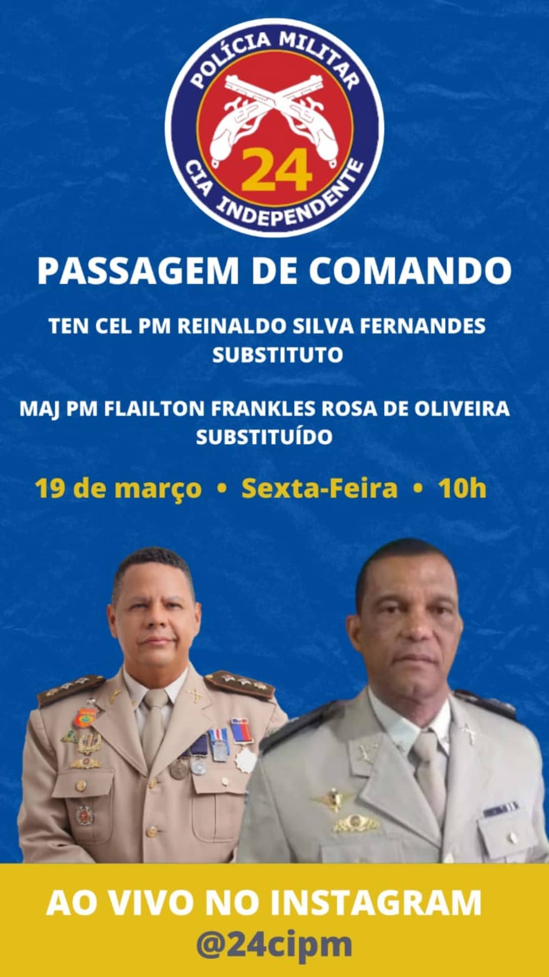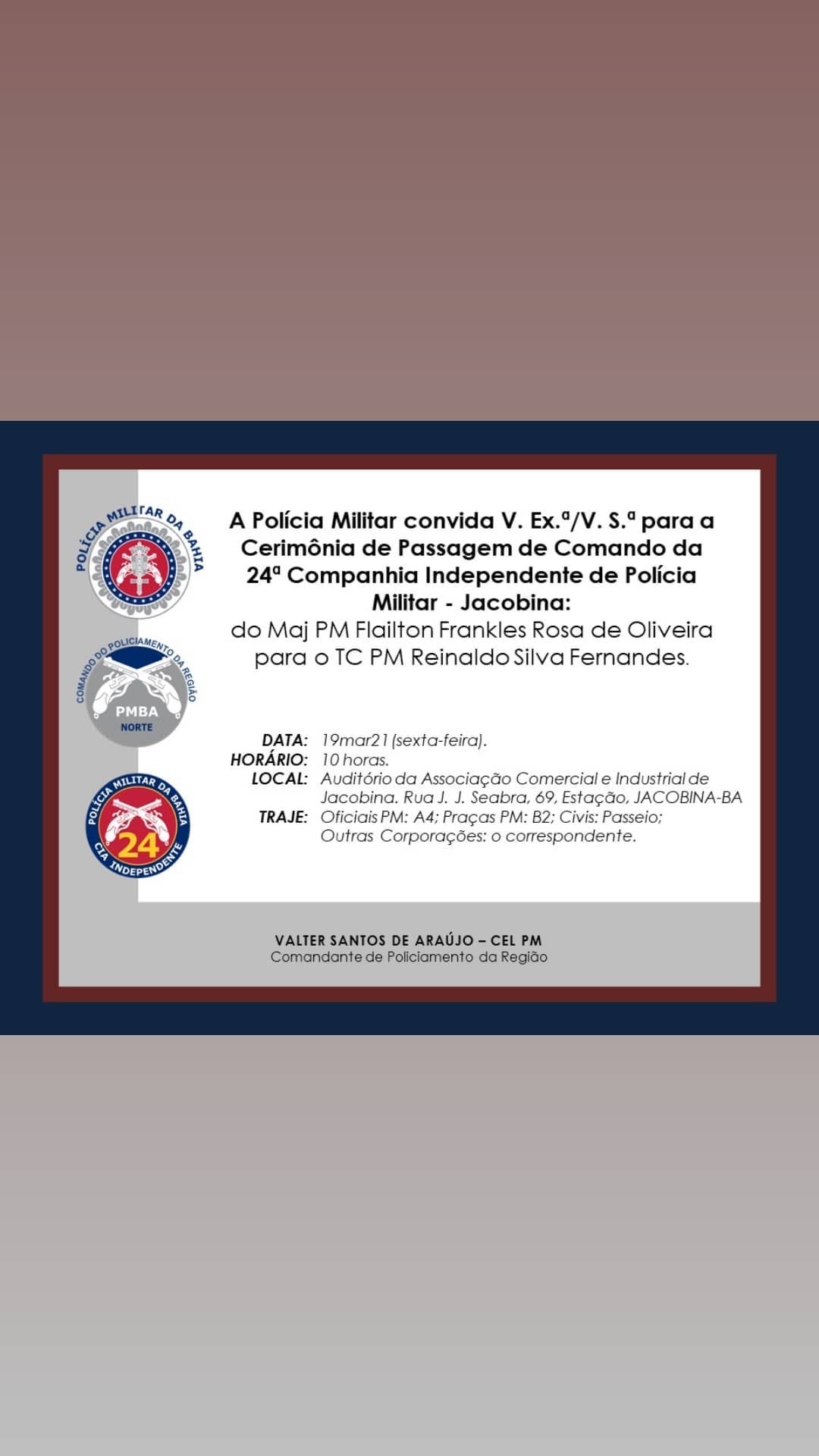Hoje 19 de março de 2021 aconteceu a Passagem de Comando na 24 Companhia Independente de Polícia Militar de Jacobina Bahia. Foi substituído Major PM Flailton Frankles Rosa de Oliveira por Tenente Coronel PM Reinaldo Silva Fernandes.