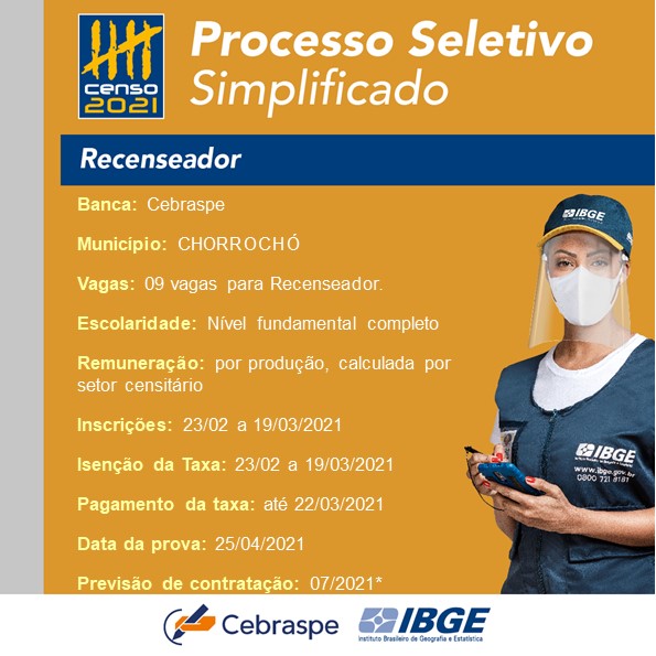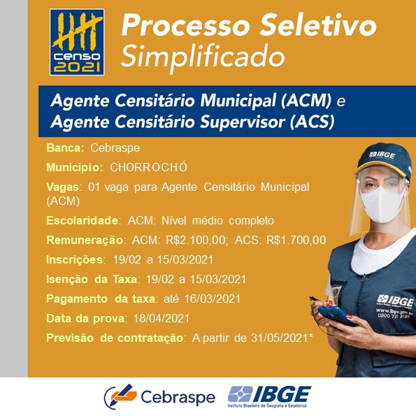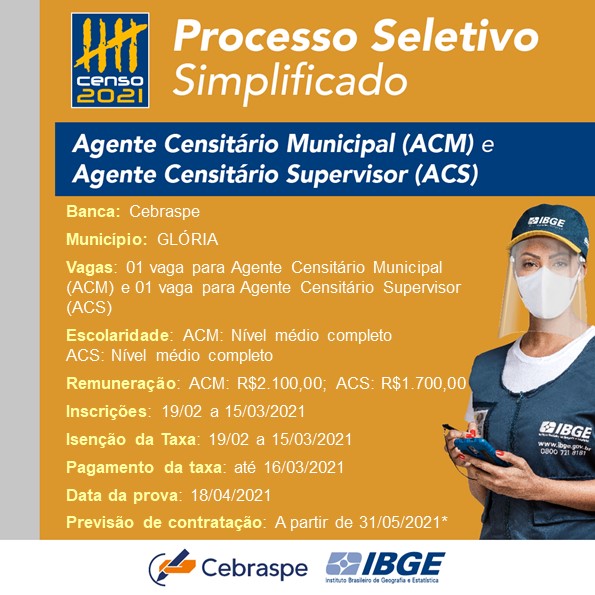 O processo seletivo para o Censo Demográfico 2021 do Instituto Brasileiro de Geografia e Estatística encerra hoje (15), às 23h59, o período de aceite de inscrições para os cargos de Agente Censitário Municipal e Agente Censitário Supervisor do concurso IBGE.