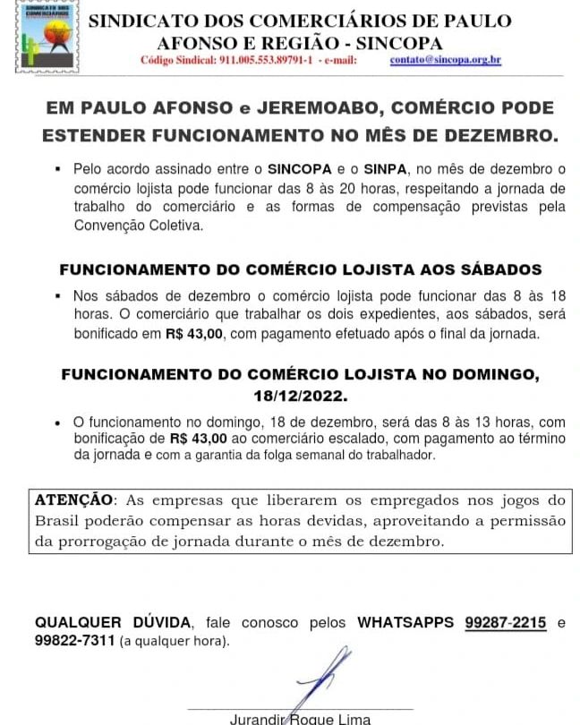BAHIA: Veja como vai ficar o funcionamento do comércio no mês de dezembro em Paulo Afonso e Jeremoabo