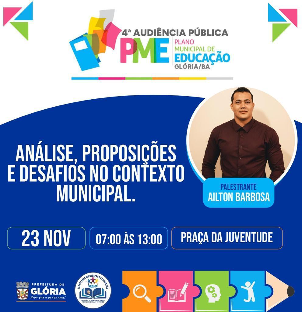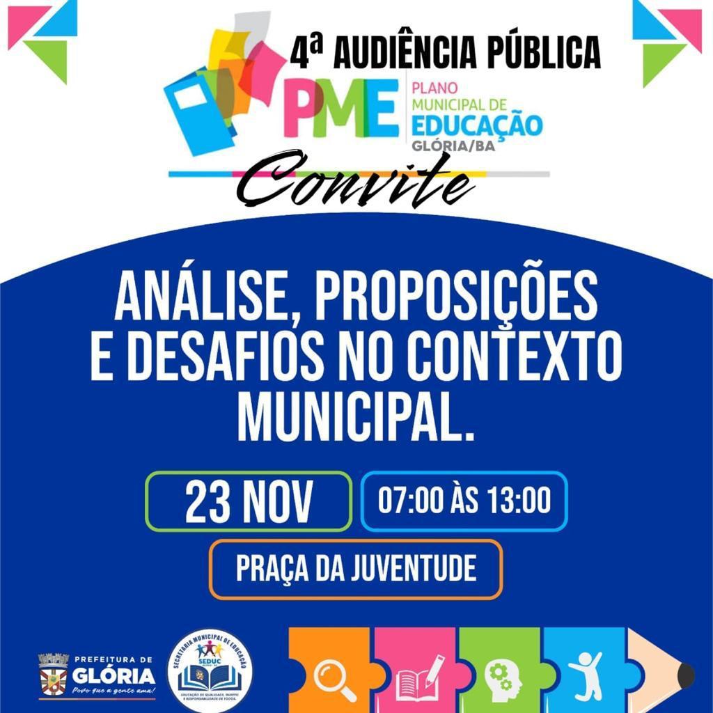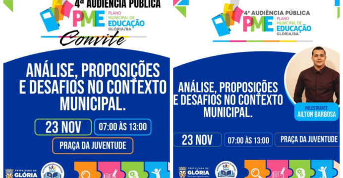 Nesta quinta-feira 23 de novembro de 2023, acontecerá a 4ª Audiência Pública do PME – Plano Municipal de Educação da cidade de Glória Bahia. A Prefeitura Municipal de Glória, através da Secretaria Municipal de Educação, Fórum Municipal de Educação e Conselho Municipal de Educação, convidam toda a sociedade para participar dessa importante audiência.