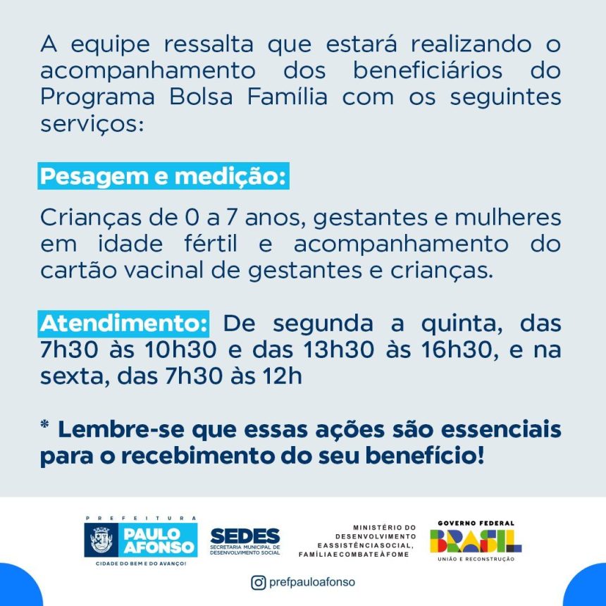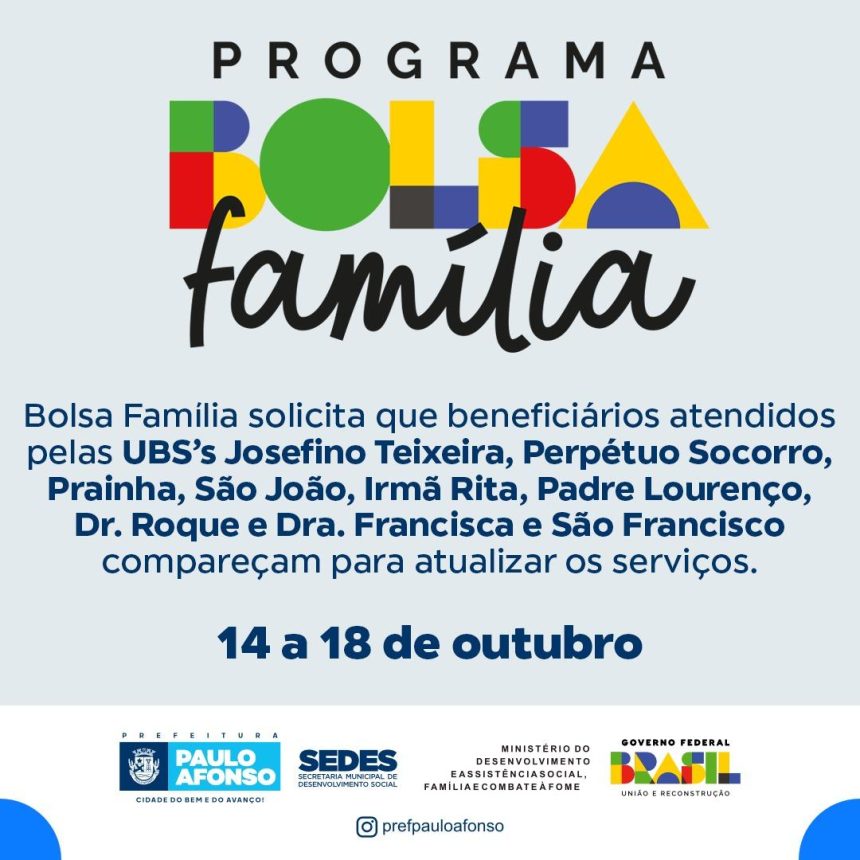 Usuários atendidos pelas Unidades Básicas de Saúde (UBS) Josefino Teixeira, Perpétuo Socorro, Prainha, São João, Irmã Rita, Padre Lourenço, Dr. Roque e Dra. Francisca e São Francisco, que recebem o benefício do Programa Bolsa Família, devem comparecer aos postos para atualizar seus serviços em Paulo Afonso.