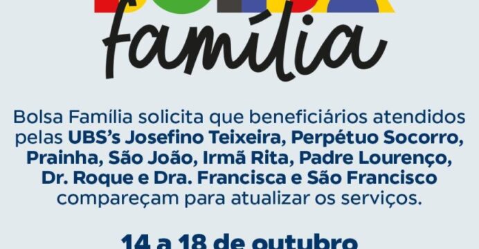 Beneficiários do Bolsa Família atendidos pelas UBS’s Josefino Teixeira, Perpétuo Socorro, Prainha, São João, Irmã Rita, Padre Lourenço, Dr. Roque e Dra. Francisca e São Francisco devem atualizar os serviços