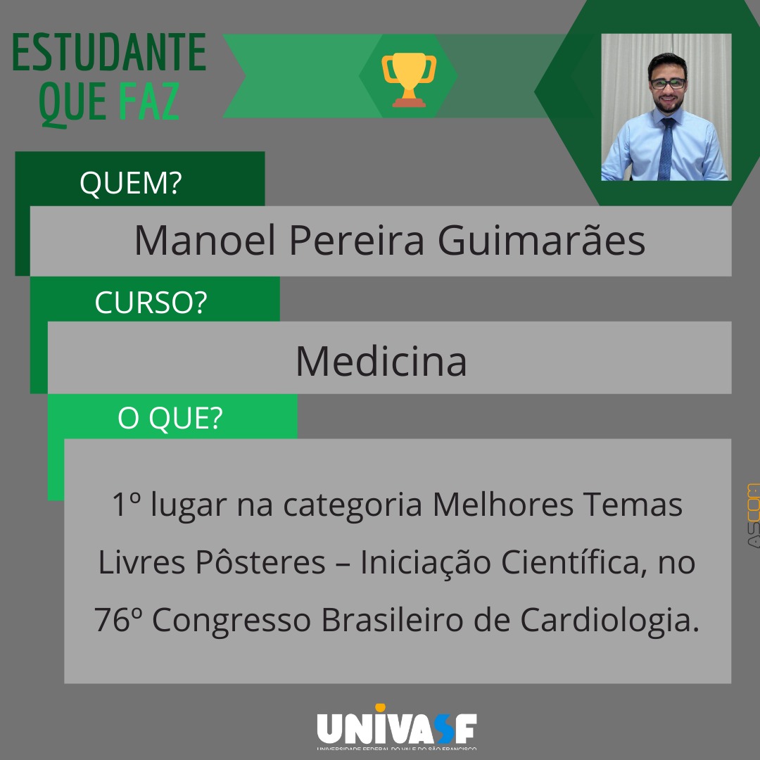 O estudante do curso de Medicina da Universidade Federal do Vale do São Francisco (Univasf) Manoel Pereira Guimarães conquistou o 1º lugar no 76º Congresso Brasileiro de Cardiologia, realizado pela Sociedade Brasileira de Cardiologia (SBC) com um trabalho realizado no âmbito do Projeto de Aterosclerose Indígena (PAI). O discente é autor principal do trabalho intitulado “O impacto do processo de urbanização sobre a saúde cardiovascular: Uma análise com as populações indígenas do interior do Nordeste brasileiro” e teve como orientador o professor do Colegiado de Medicina do Campus Sede Anderson Armstrong, coordenador do PAI. A pesquisa foi apresentada na categoria Melhores Temas Livres Pôsteres – Iniciação Científica.