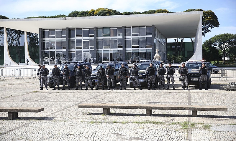 Militares e Veículos da Força Nacional de Segurança Pública do Brasil, em frente ao Palácio do Planalto e naPraça dos Três Poderes em Brasília