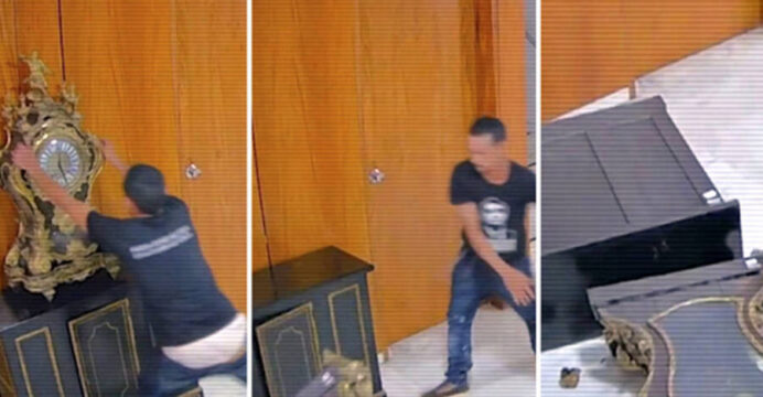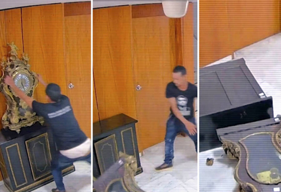 O homem foi flagrado pelas filmagens internas do palácio, no último dia 8, jogando no chão o relógio e, depois, tentando quebrar as câmeras do circuito interno com um extintor. O suspeito vestia uma camiseta com o rosto do ex-presidente Jair Bolsonaro (PL).