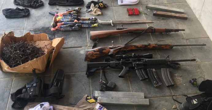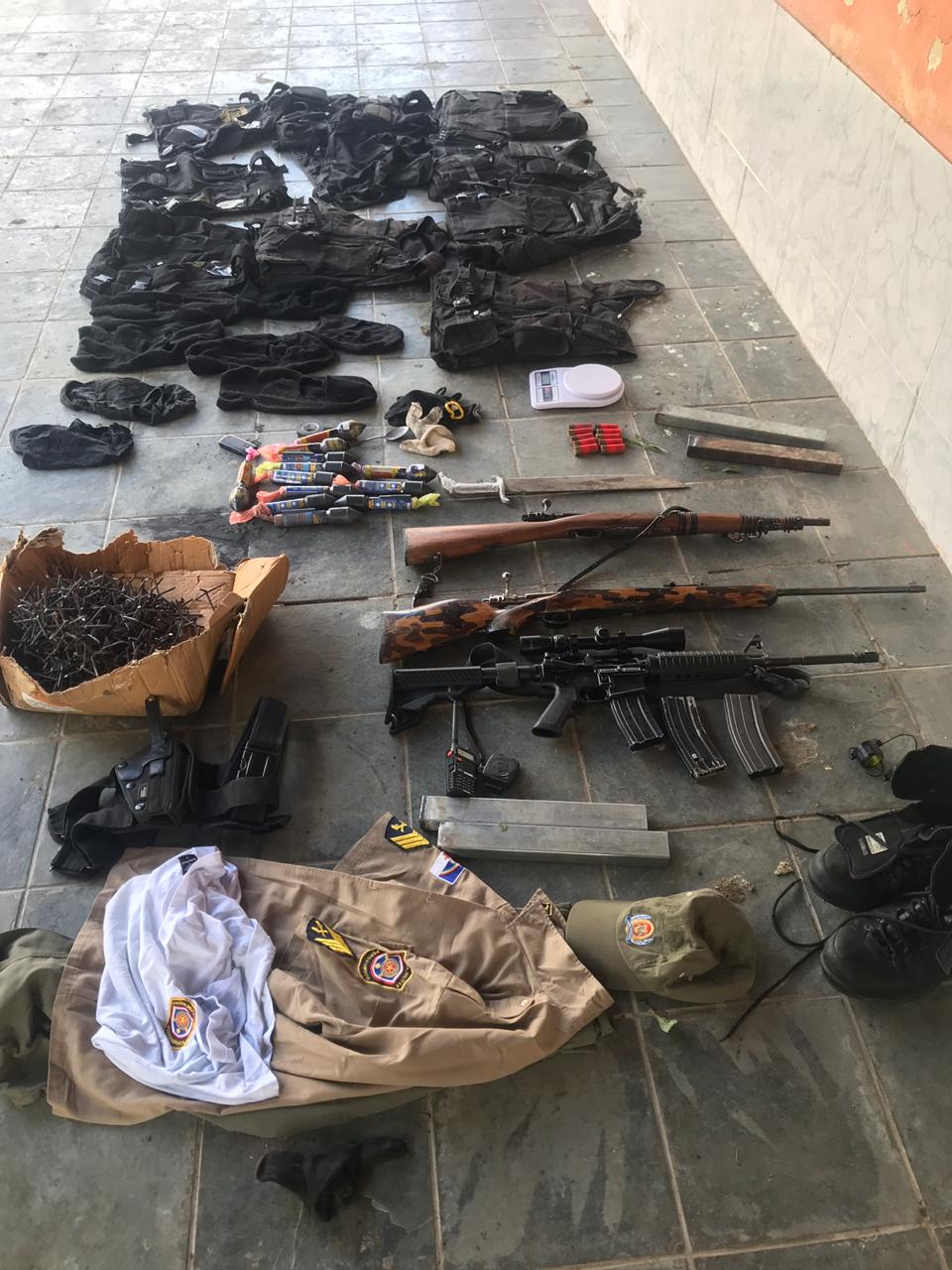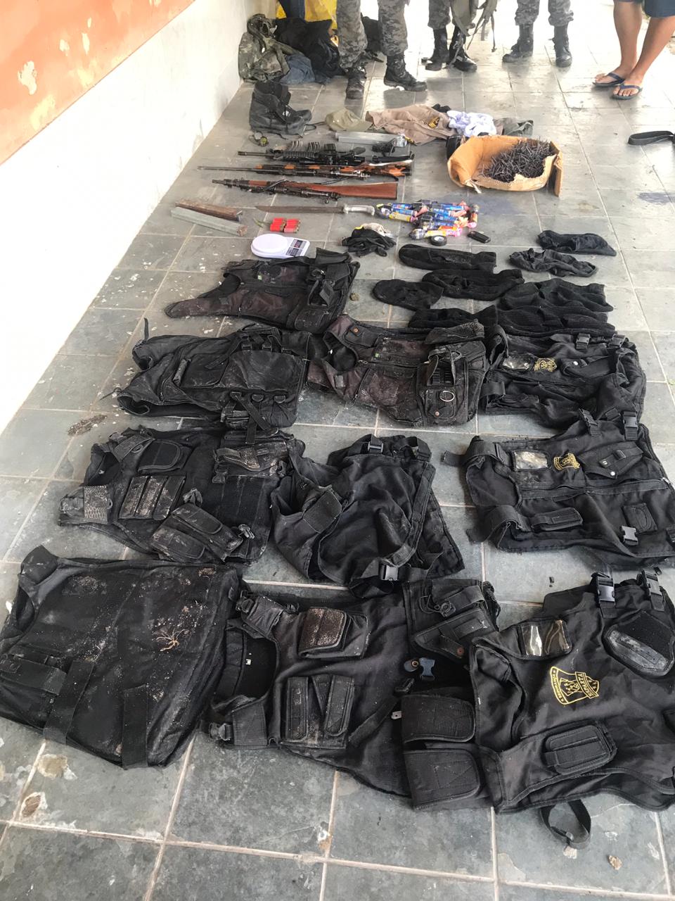 04 fuzis 5,56; 02 fuzis 7,62; 02 pistolas (uma 380 e uma 9mm); 05 balaclavas; 06 pares de placas de coletes com capas; 04 capas de coletes sem placas; grampos; 01 uniforme da PMPE; 12 artefatos de explosivos.
