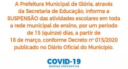Como medida diretamente ligada à situação de emergência em saúde pública provocada pelo novo coronavírus – Covid-19, a Prefeitura de Glória, através da Secretaria de Educação, passa a esclarecer a situação de distribuição de gêneros alimentícios...