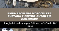 PMBA RECUPERA MOTOCICLETA FURTADA E PRENDE AUTOR EM JEREMOABO