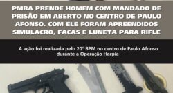 PMBA PRENDE HOMEM COM MANDADO DE PRISÃO EM ABERTO NO CENTRO DE PAULO AFONSO. COM ELE FORAM APREENDIDOS SIMULACRO, FACAS E LUNETA PARA RIFLE