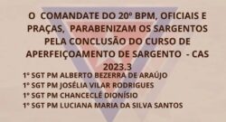 O 20⁰ BPM, comandado pelo Ten Cel PM Sena, parabeniza os policiais da unidade pela conclusão no Curso de Aperfeiçoamento de Sargentos no dia 30/01/2024. Concluíram o CAS os Sgt PM Alberto Bezerra de Araújo, Sgt...