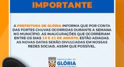 A Prefeitura de Glória informa que, em virtude das fortes chuvas que ocorreram durante a semana no nosso Município, as inaugurações que estavam programadas para os dias 19 e 21 de agosto estão adiadas. As novas...