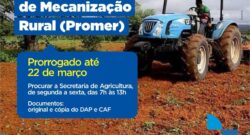 O prazo de inscrição para o Programa de Mecanização Rural (Promer) de 2024 foi estendido. Agora, os agricultores têm até o dia 22 de março para se inscreverem. Atualmente, a equipe está responsável pelos registros de...