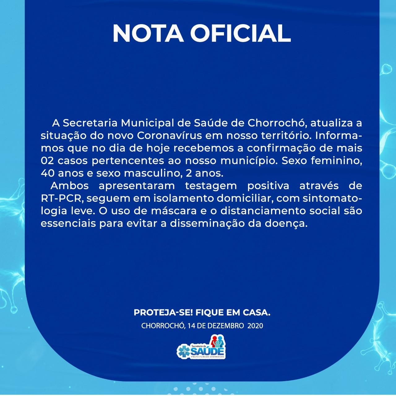 A Prefeitura Municipal de Chorrochó Bahia através da Secretaria de Saúde do município emitiu nesta segunda-feira 14 de dezembro de 2020, mais uma Nota Oficial de atualização do Covid-19. Após a euforia das Eleições para prefeito e vereadores a proliferação tende a aumentar nos próximos meses.