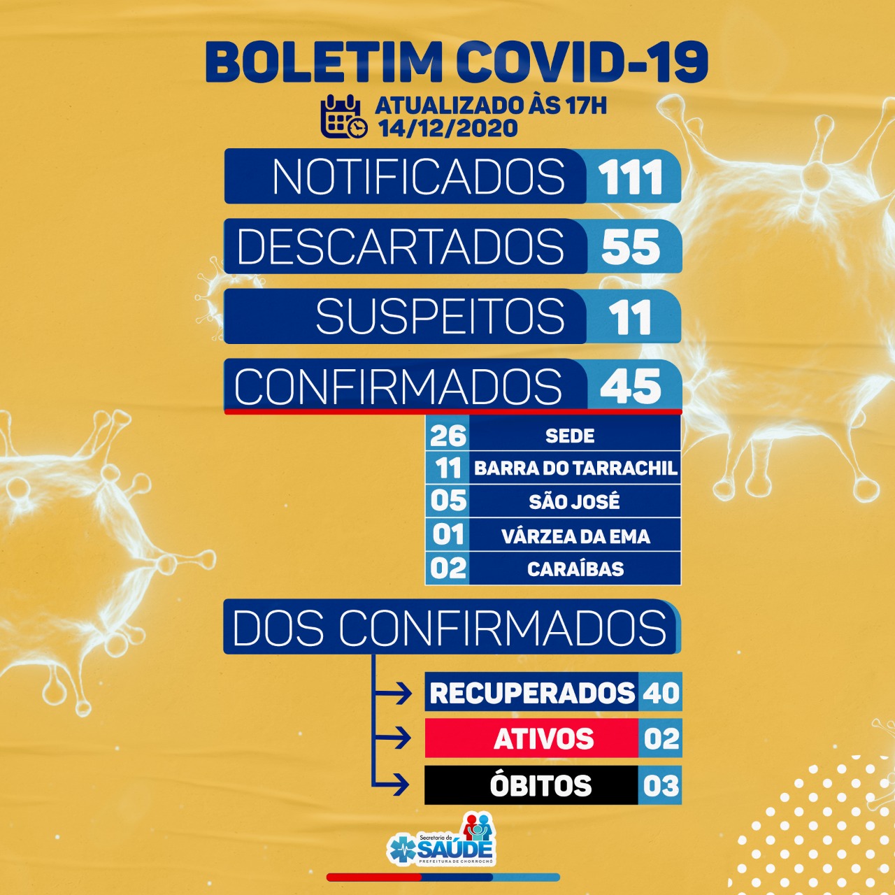 Segundo a nota são três óbitos, 40 recuperados e dois ativos. Tem 111 notificados, 55 descartados, 11 suspeitos e 45 confirmados, são 26 na Sede do Município, 11 Povoado Barra do Tarrachil, 05 Povoado São José, 02 no Povoado Caraíba e 01 no Povoado Várzea.