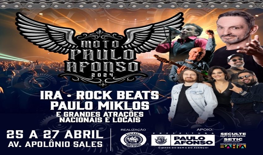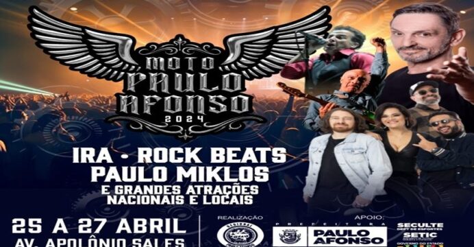 Durante três dias, de 25 a 27 de abril, o Moto Paulo Afonso oferta ao público muita diversão, adrenalina. O evento, que é um marco para motociclistas de todo o país, este ano traz na sua programação as bandas nacionais Rock Beat, Ira e Paulo Miklos, além de outras atrações renomadas e os artistas da terra.