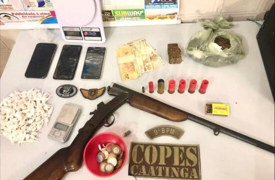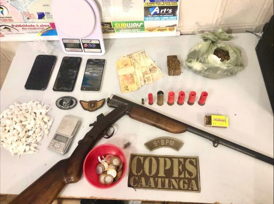 Com os suspeitos, os militares apreenderam crack, maconha, celulares, uma quantidade em espécie de dinheiro, balança de precisão e uma espingarda de marca e calibre não informados, conforme imagem publicada nas redes sociais da Copes-Caatinga.