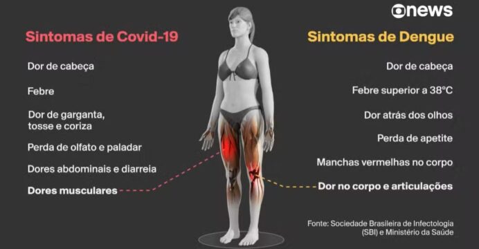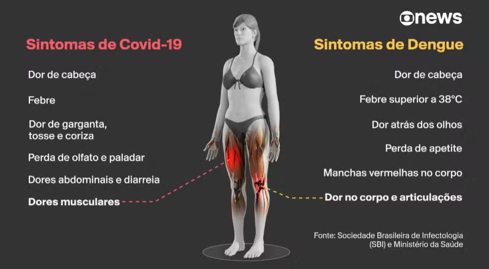 “A febre na dengue costuma ser mais alta, a dor no corpo costuma ser maior, dor articular é mais frequente, assim como dor atrás dos olhos, manchas na pele. Esses sintomas podem até aparecer na Covid, mas é mais comum na dengue. A Covid tem mais sintomas respiratórios, como tosse, secreção, dificuldade para respirar, que em geral a dengue não tem“, explica o infectologista Renato Kfouri, vice-presidente da Sociedade Brasileira de Imunizações (SBIm).