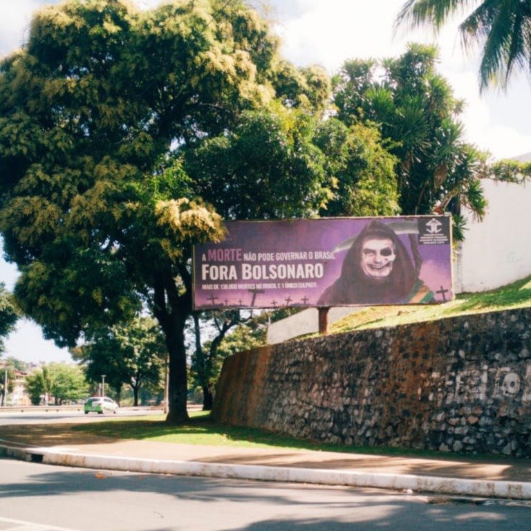 No outdoor, exibido em uma das áreas mais movimentadas de Salvador, estava escrito: “A morte não pode governar o Brasil. Fora Bolsonaro. Mais de 130 mil mortes e um único culpado”.