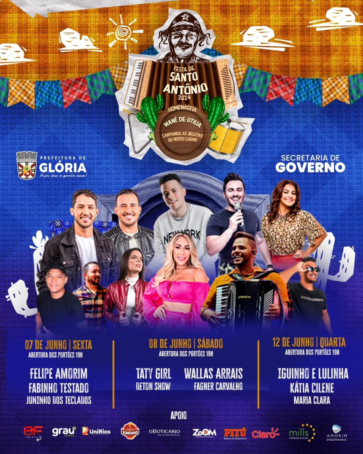 Festa de Santo Antônio em Glória terá shows de Felipe Amorim, Taty Girl, Iguinho e Lulinha e mais; confira a programação