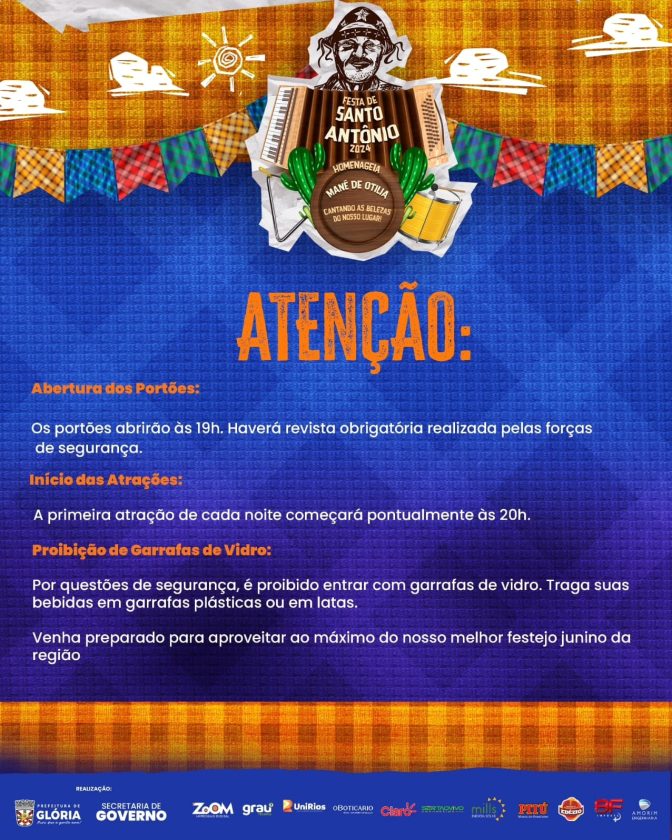 A Prefeitura de Glória promete uma experiência inesquecível: “Prepare-se para vivenciar a melhor Festa de Santo Antônio! Prometemos momentos memoráveis, e você pode fazer parte de toda essa diversão. Venha dançar, cantar e celebrar conosco o melhor festejo junino da região.”