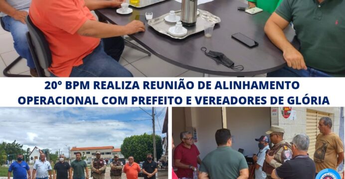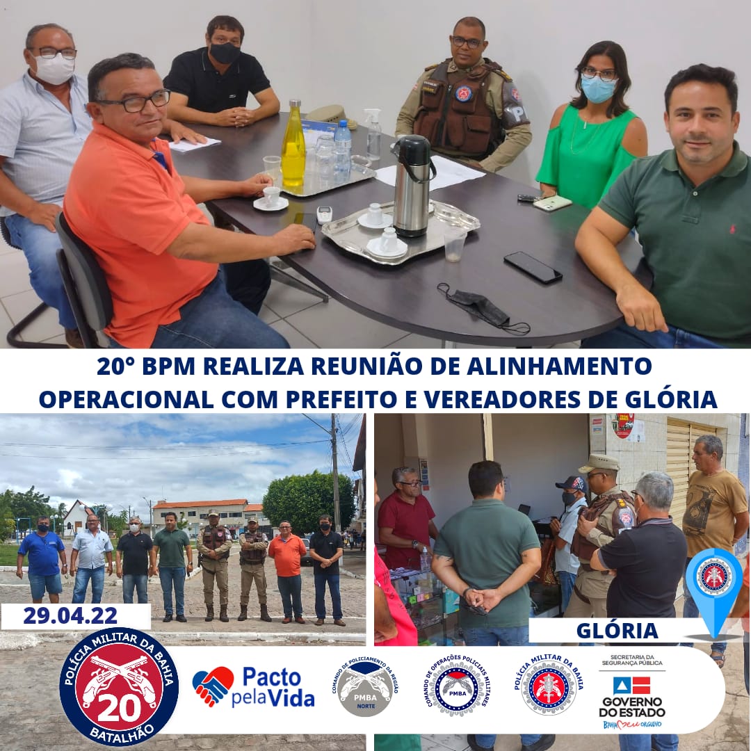 A Polícia Militar da Bahia (PMBA), através do 20º Batalhão de Polícia Militar, Unidade Operacional comandada pelo Ten Cel PM Gabriel Neto, subordinada ao Comando de Policiamento da Região Norte (CPR-N), comandado pelo Coronel PM Valter Araújo, realizou reunião reunião de alinhamento Operacional com prefeito e vereadores de Glória Bahia, nesta sexta-feira 29 de abril de 2022, uma importante reunião com o Prefeito e Vereadores de Glória para alinhamentos operativos no sentido de melhorar a sensação de segurança à população, como também em relação a eventos que serão realizados doravante.
