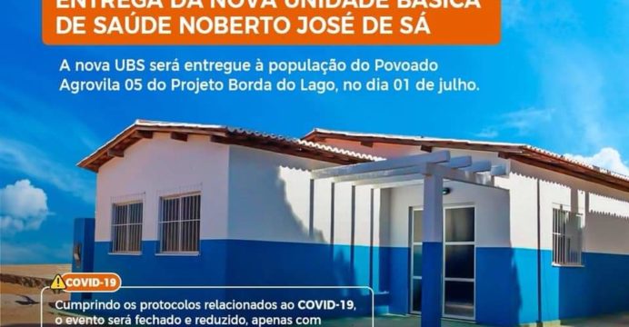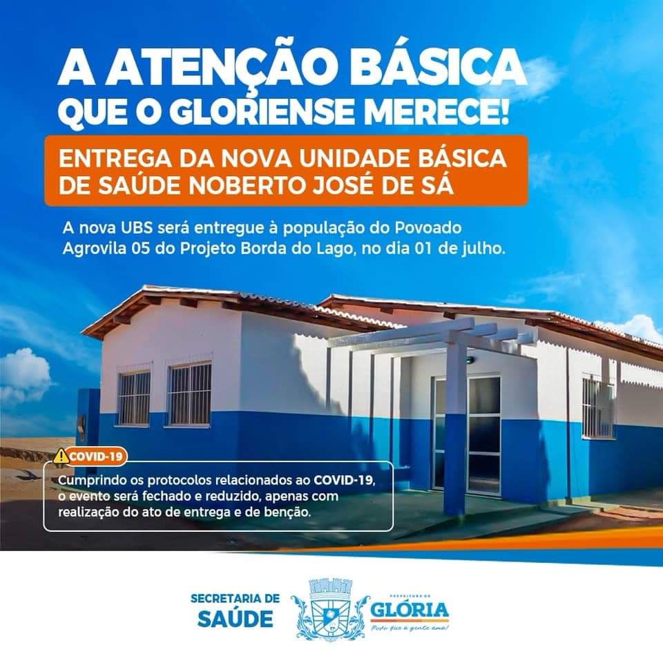 Nesta quarta-feira, dia primeiro, a Prefeitura de Glória realizará, através da Secretaria de Saúde, no Povoado Agrovila 05 do Projeto Borda do Lago, a entrega da nova UBS-Unidade Básica de Saúde.