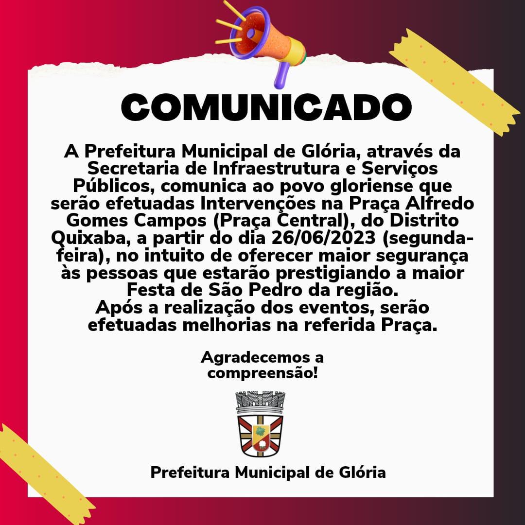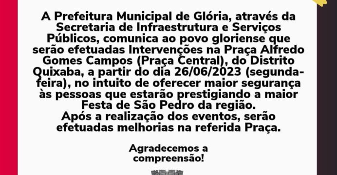 A Prefeitura Municipal de Glória Bahia, através da Secretaria de Infraestrutura e Serviços Públicos, comunica ao povo gloriense que serão efetuadas Intervenções na Praça Alfredo Gomes Campos (Praça Central), do Distrito Quixaba, a partir do dia 26/06/2023 (segunda-feira), no intuito de oferecer maior segurança às pessoas que estarão prestigiando a maior Festa de São Pedro da região.
