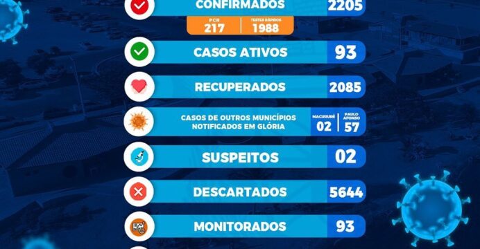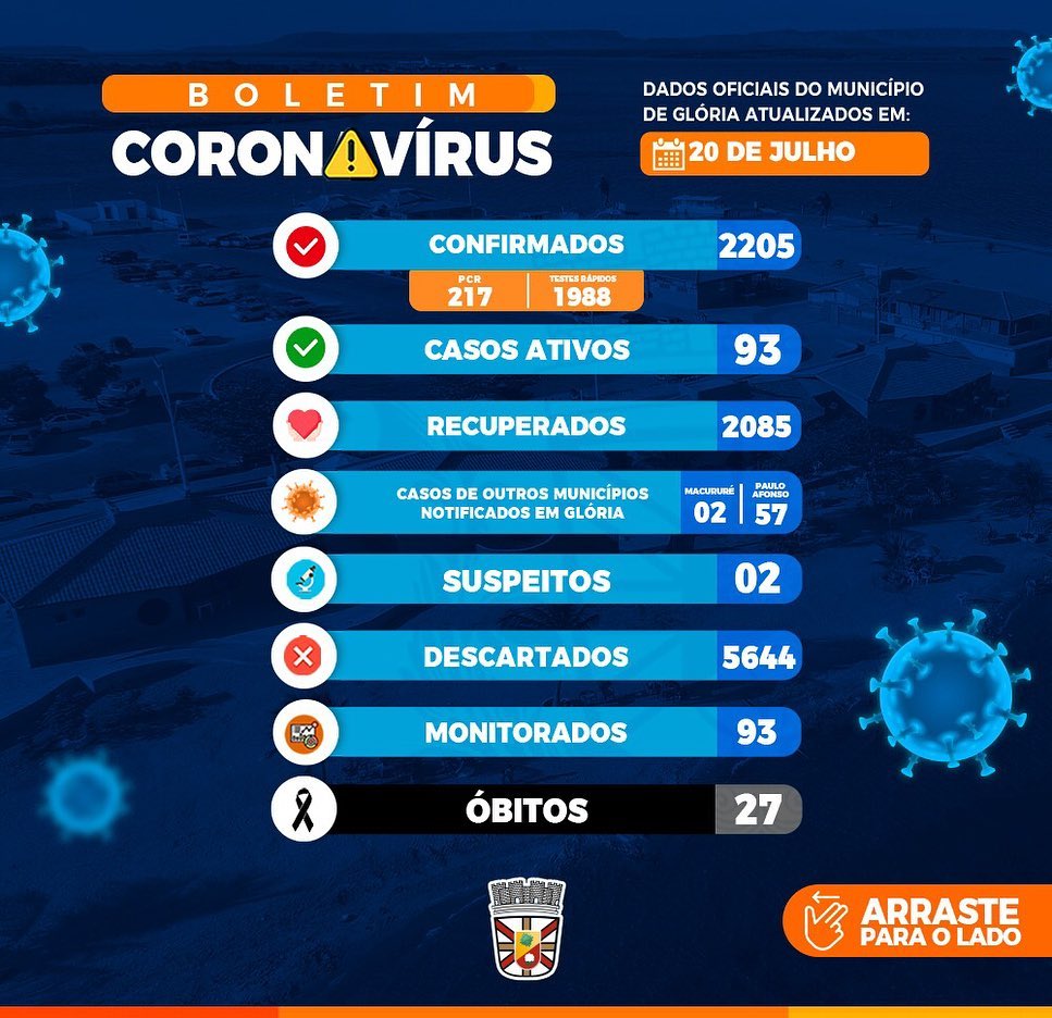 A cidade registrou 93 casos ativos de Covid-19 no município, que estão sendo monitorados. Esses dados sao oficiais do município de Gloria Bahia atualizados em 20 de julho de 2022. Veja tabela abaixo: