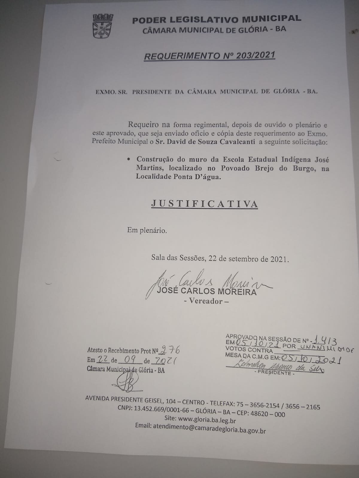 O Vereador José Carlos Coelho “Carlinhos do Brejo” – PSD deu entrada dia 06 de outubro na Sessão Ordinária na Câmara Municipal de Vereadores da cidade de Glória Bahia com um Requerimento Número 203/2021, onde foi aprovado por unanimidade dos vereadores presentes.