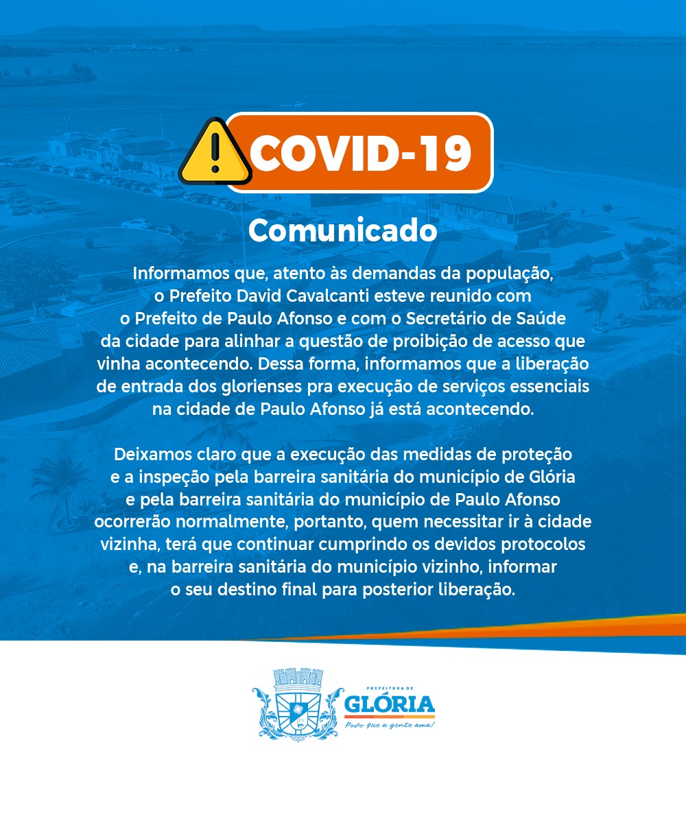 Informamos que a liberação de entrada dos glorienses para execução de serviços essenciais na cidade de Paulo Afonso já está acontecendo, portanto quem precisar se deslocar até à cidade vizinha, terá que continuar cumprindo os devidos protocolos.