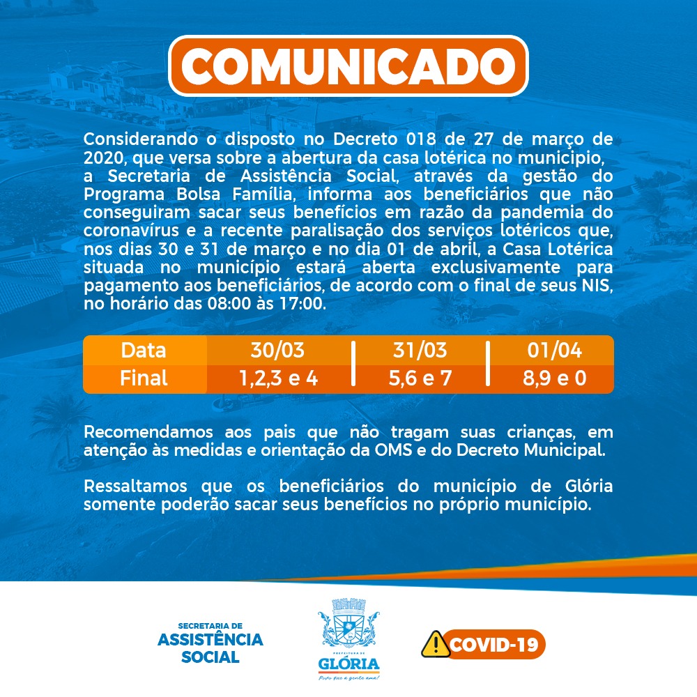 Em decorrência à pandemia do Coronavírus (COVID-19) e a recente paralisação dos serviços lotéricos, informamos que a lotérica de Glória estará aberta para pagar os beneficiários do município.