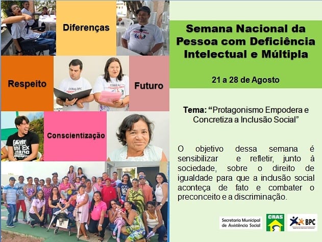 A Secretaria de Assistência Social, através do Centro de Referência de Assistência Social – CRAS. Destaca o mês de agosto como o mês importante para a Comunidade ” Semana Nacional da Pessoa com Deficiência Intelectual e Múltipla”.