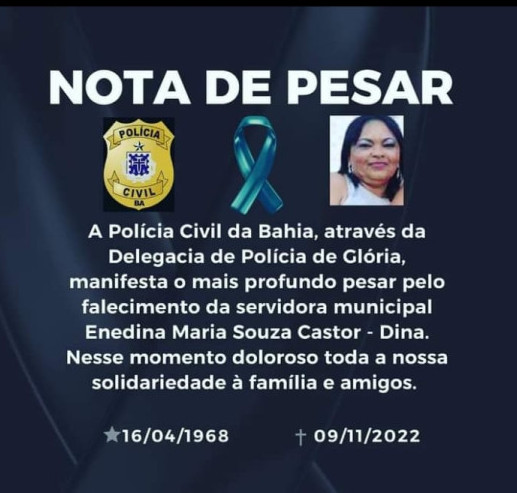 O Delegado da Polícia Civil Marco Bacelar emitiu Nota de Pesar pelo falecimento de DINA, ela prestava serviço na Delegacia Municipal da Cidade de Glória Bahia.