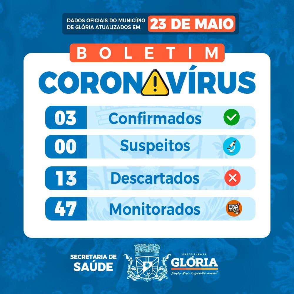 A SMS-Secretaria Municipal de Saúde da cidade de Glória Bahia recebeu hoje 23 de maio de 2020 a confirmação do terceiro caso de coronavírus no município. A secretaria informa que todos os cuidados médicos e técnicos já vem sendo executados pelas as equipes de saúde.