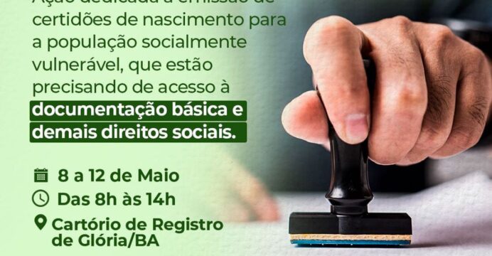 Glória-BA: Em parceria com CNJ e Cartório de Registros, acontecerá no Município a Semana Nacional de Registro Civil