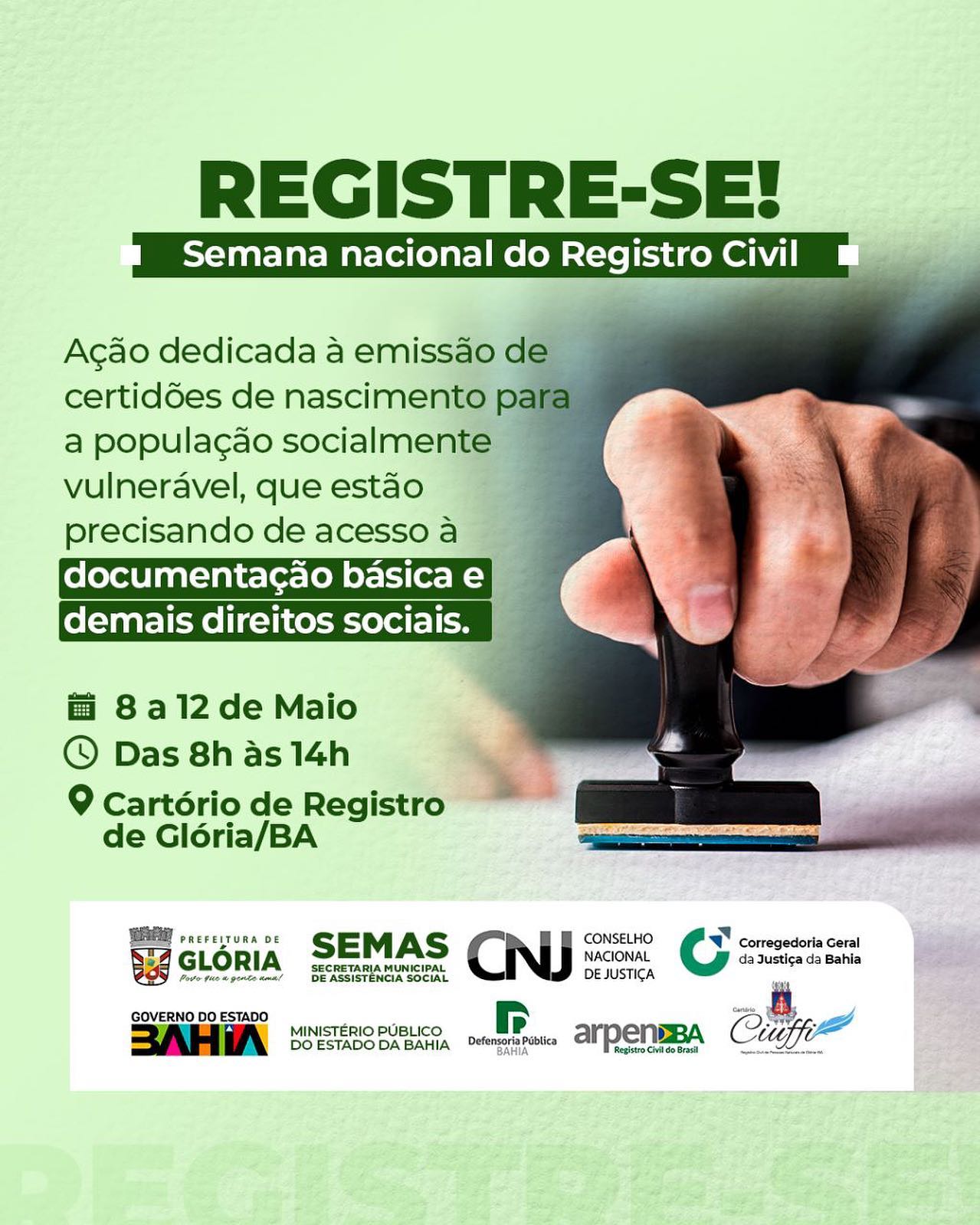 A Prefeitura Municipal de Glória, através da Secretaria Municipal de Assistência Social, juntamente com o Cartório Civil de Pessoas Naturais estarão promovendo a ação REGISTRE-SE, a qual faz parte de um programa criado pela Corregedoria Nacional de Justiça.
