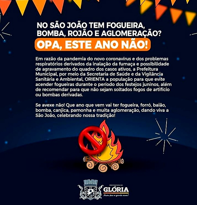 Por medidas de segurança e em razão da pandemia do novo coronavírus e dos malefícios da fumaça para as pessoas com problemas respiratórios, a Secretaria de Saúde orienta a população para não acender fogueiras este ano.