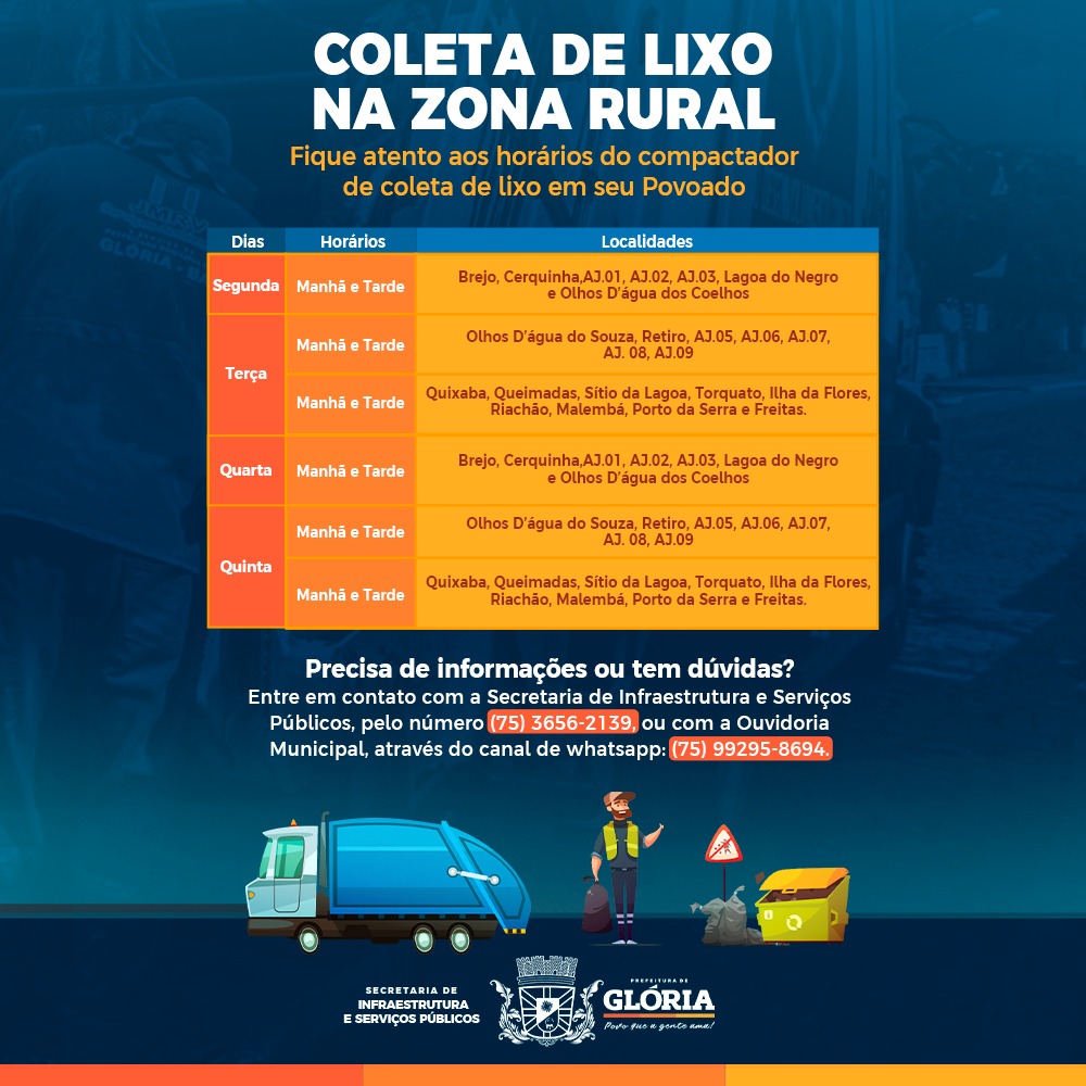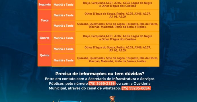 Fique atento aos horários de coleta em seu povoado e, em caso de dúvidas, entre em contato com a Secretaria de Infraestrutura ou com o canal de whatsapp da Ouvidoria Municipal.