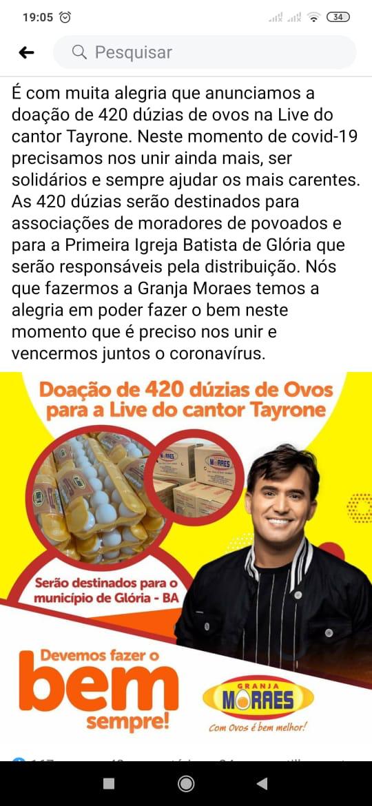 “É com muita alegria que anunciamos a doação de 420 dúzias de ovos na Live do cantor Tayrone. Neste momento de covid-19 precisamos nos unir ainda mais, ser solidários e sempre ajudar os mais carentes. As 420 dúzias serão destinados para associações de moradores de povoados e para a Primeira Igreja Batista de Glória que serão responsáveis pela distribuição. Nós que fazermos a Granja Moraes temos a alegria em poder fazer o bem neste momento que é preciso nos unirmos e vencermos juntos o coronavírus”. Comentou.