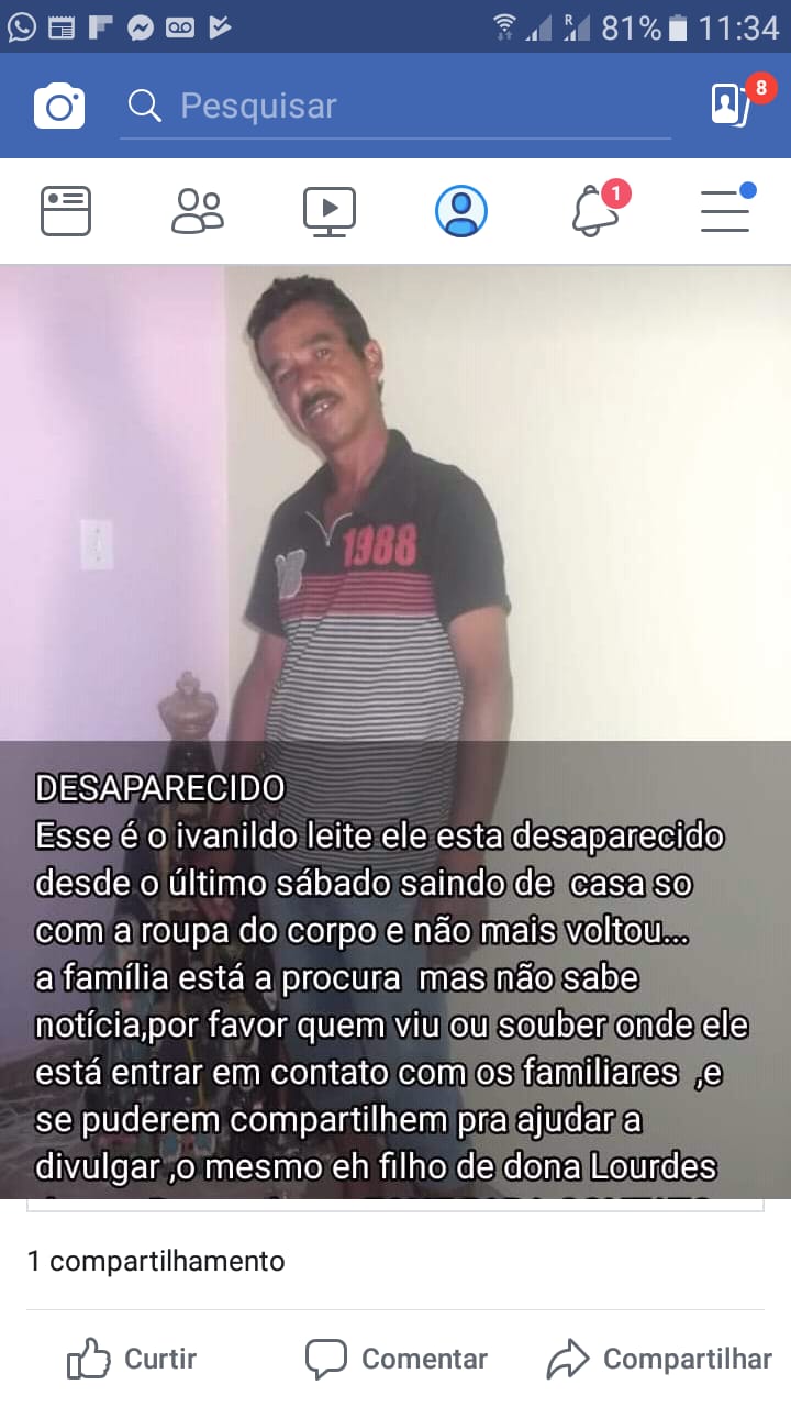 Ivanildo Leite já estava sendo procurado por familiares, como mostra foto distribuídas nas redes sociais.