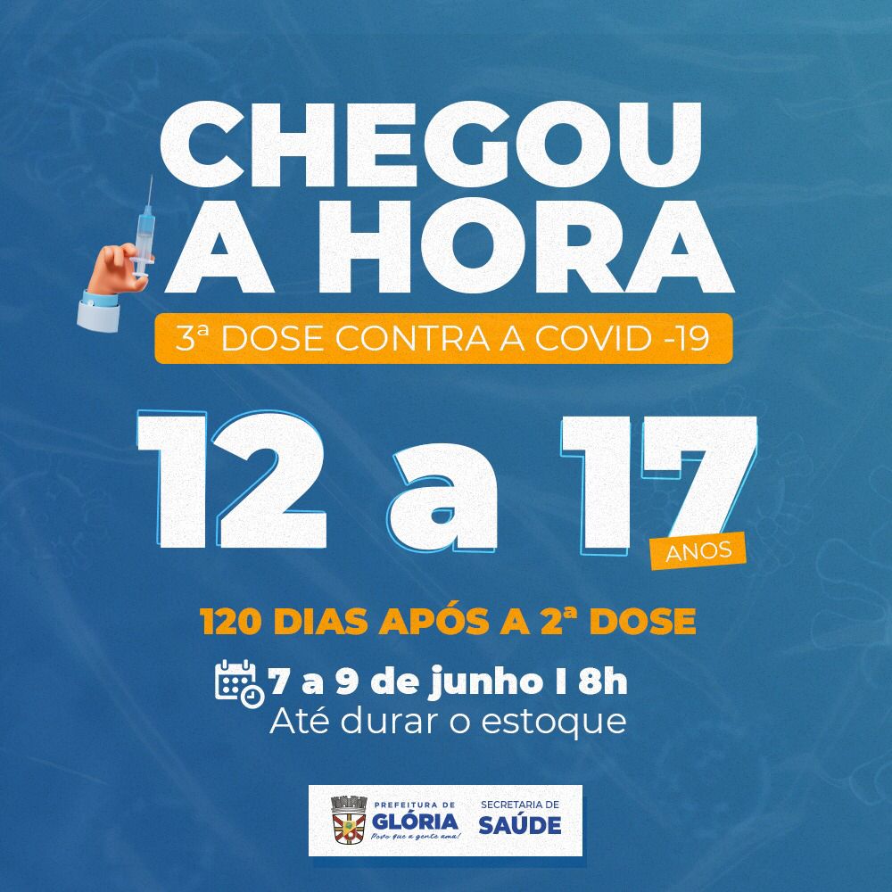 Bora vacinar? Chegou o momento da terceira dose de 12 a 17 anos Se vacinar é muito importante! Se dirija ao Posto de Saúde mais próximo da sua residência e vacine-se! #GloriaContraaCovid19.