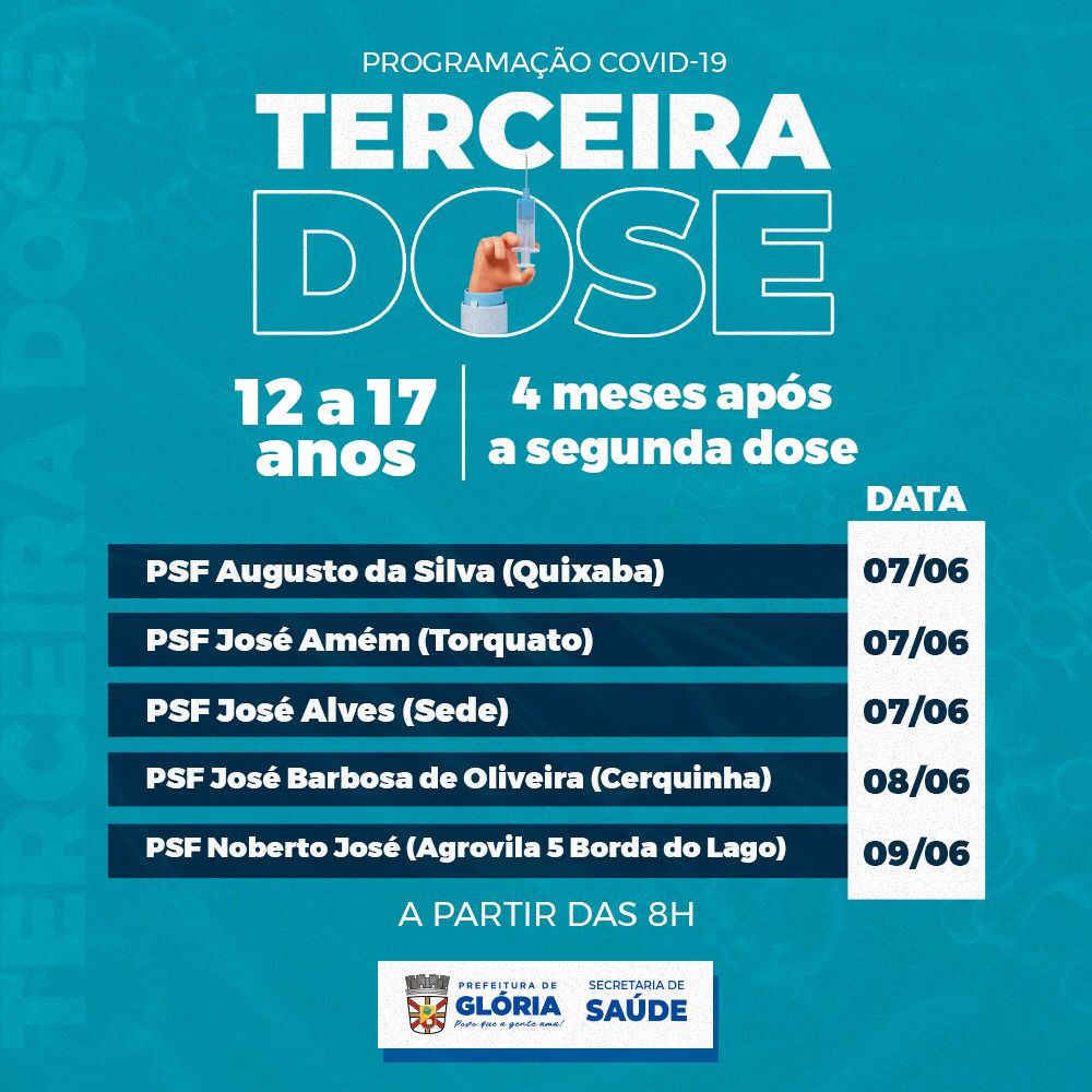 A Prefeitura Municipal de Glória Bahia através da Secretaria Municipal de Saúde convoca jovens de 12 e 14 anos de idade para tomar a Terceira Dose da vacina contra Covid-19. A vacinação acontece a partir das 08h dia 07 à 09 de junho de 2022 até durar o estoque.